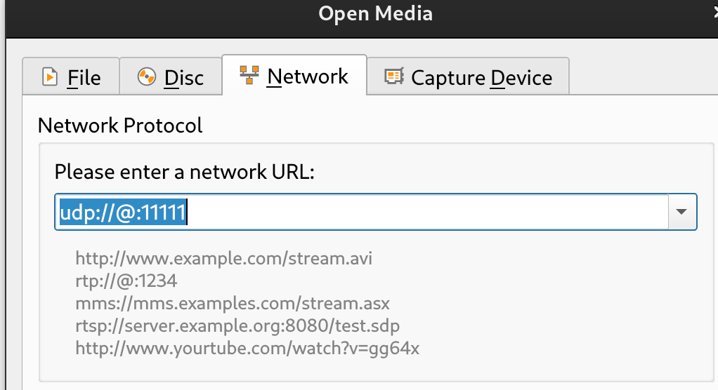 So the stream is running. now on the target machine in VLC in a new window open a network stream to the address